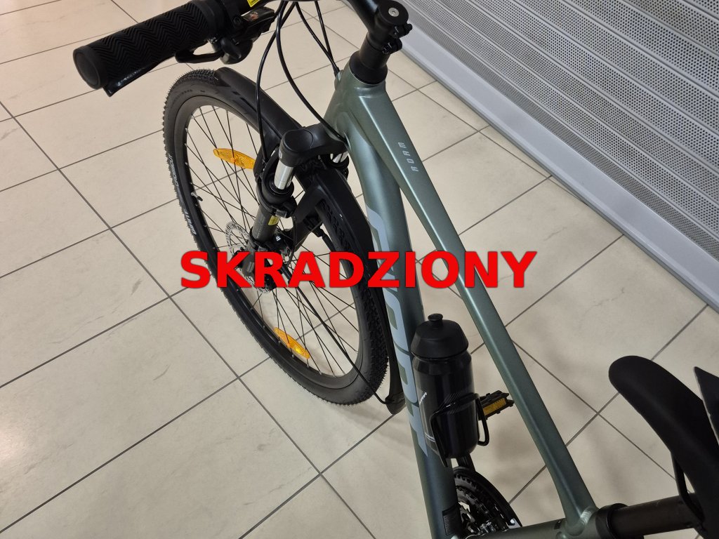 Rower nowy, po jednej przejażdżce, bez śladów użytkowania, w momencie kradzieży wyposażony w błotniki i czarny bidon w uchwycie.